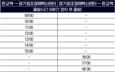 1. ¼ö¼Û ÄÚ½º - ¿îÇà ±¸°£ : ÆÇ±³¿ª ¡ê °æ±ââÁ¶°æÁ¦Çõ½Å¼¾ÅÍ (Æíµµ 1.2km) - ¼Ò¿ä ½Ã°£: ¾à 5ºÐ 2. ¼ö¼Û ¹ö½º : 28Àν ¸®¹«Áø ¹ö½º 2. ¿îÇà ½Ã°£ - Ãâ¹ß ½Ã°£ : ¸ÅÀÏ 09:00 ~ 18:30 (1½Ã°£ °£°Ý ¿îÇà) ¡Ø ¸Å½Ã Á¤°¢ Ãâ¹ß ¡æ 5ºÐ°£ Á¤Â÷ ÈÄ Ãâ¹ß ¡Ø ¸¶Áö¸· Â÷: 18:00 Ãâ¹ß (17:55 Á¤Â÷)